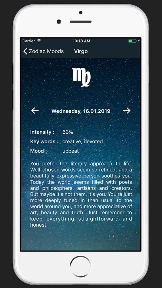 In addition to horospoce, zodiac's mood on that day as well some key words describing his personality are also presented to user.