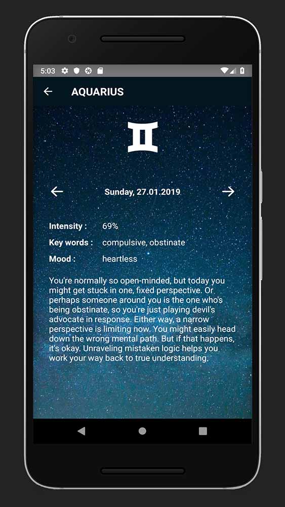 In addition to horospoce, zodiac's mood on that day as well some key words describing his personality are also presented to user.